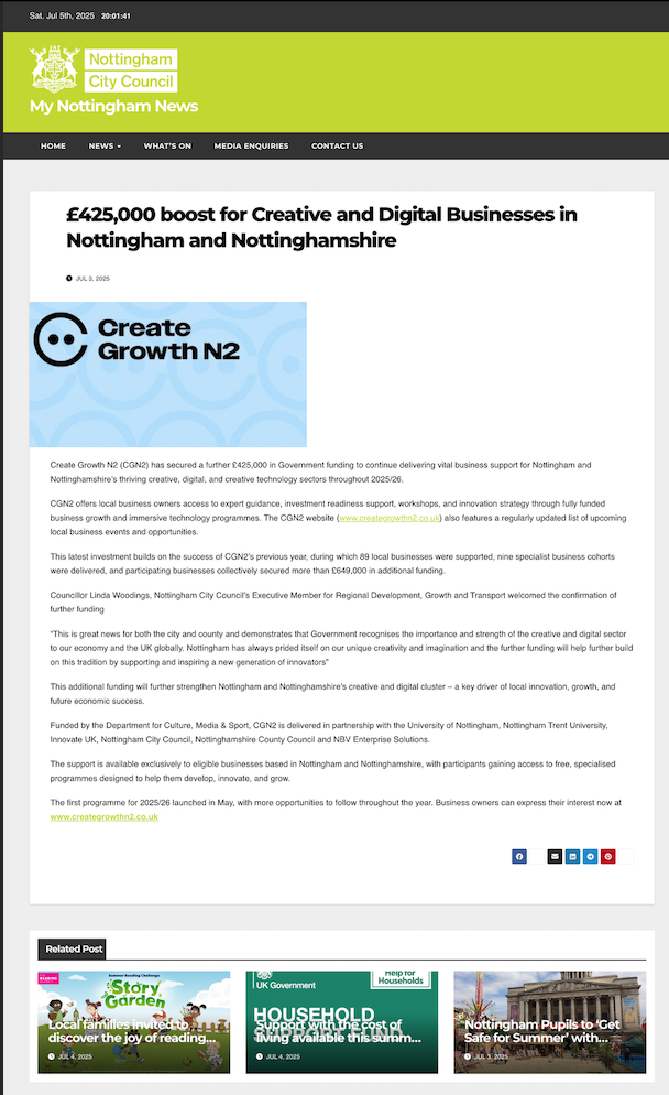 Press release: £425,000 boost for Creative and Digital Businesses in Nottingham and Nottinghamshire